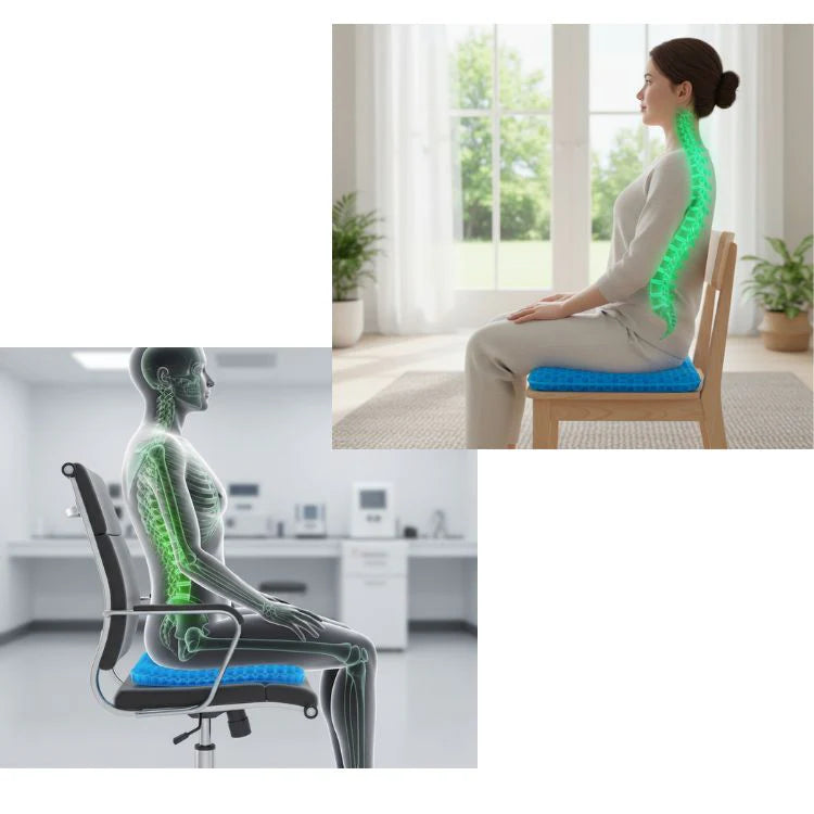 The CoolGel+ Seat Cushion helps you sit more comfortably by evenly distributing pressure and using cooling technology to prevent heat buildup. This allows you to sit longer with less discomfort, while also helping to maintain good posture by supporting your spine.